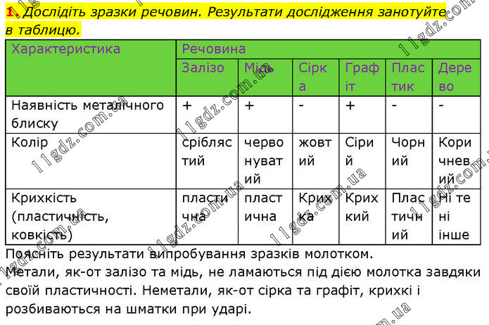 Дослідіть зразки речовин. Результати дослідження занотуйте в таблицю. Поясніть результати випробування зразків молотком. Метали, як-от залізо та мідь, не ламаються під дією молотка завдяки своїй пластичності. Неметали, як-от сірка та графіт, крихкі і розбиваються на шматки при ударі.