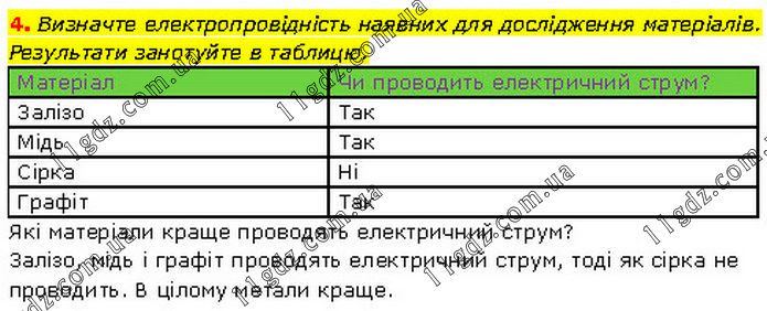 Визначте електропровідність наявних для дослідження матеріалів. Результати занотуйте в таблицю. Які матеріали краще проводять електричний струм? Залізо, мідь і графіт проводять електричний струм, тоді як сірка не проводить. В цілому метали краще.