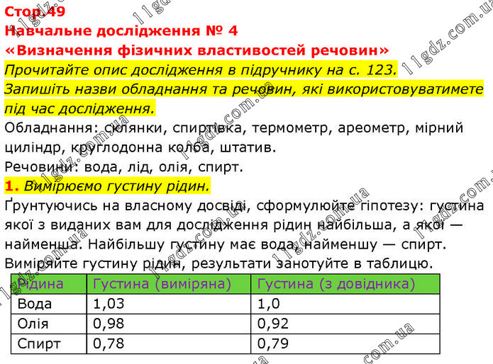Навчальне дослідження № 4 «Визначення фізичних властивостей речовин» Прочитайте опис дослідження в підручнику на с. 123. Запишіть назви обладнання та речовин, які використовуватимете під час дослідження. Обладнання: склянки, спиртівка, термометр, ареометр, мірний циліндр, круглодонна колба, штатив. Речовини: вода, лід, олія, спирт. 1. Вимірюємо густину рідин. Ґрунтуючись на власному досвіді, сформулюйте гіпотезу: густина якої з виданих вам для дослідження рідин найбільша, а якої — найменша. Найбільшу густину має вода, найменшу — спирт. Виміряйте густину рідин, результати занотуйте в таблицю.