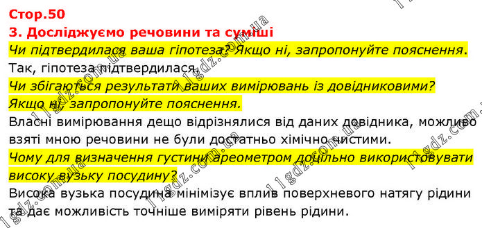 Стор.50 3. Досліджуємо речовини та суміші Чи підтвердилася ваша гіпотеза? Якщо ні, запропонуйте пояснення. Так, гіпотеза підтвердилася. Чи збігаються результати ваших вимірювань із довідниковими? Якщо ні, запропонуйте пояснення. Власні вимірювання дещо відрізнялися від даних довідника, можливо взяті мною речовини не були достатньо хімічно чистими. Чому для визначення густини ареометром доцільно використовувати високу вузьку посудину? Висока вузька посудина мінімізує вплив поверхневого натягу рідини та дає можливість точніше виміряти рівень рідини.