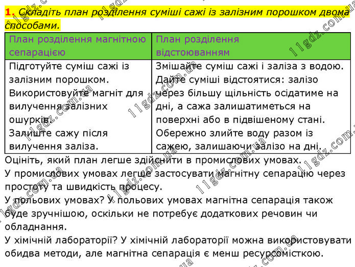 Складіть план розділення суміші сажі із залізним порошком двома способами. Оцініть, який план легше здійснити в промислових умовах. У промислових умовах легше застосувати магнітну сепарацію через простоту та швидкість процесу. У польових умовах? У польових умовах магнітна сепарація також буде зручнішою, оскільки не потребує додаткових речовин чи обладнання. У хімічній лабораторії? У хімічній лабораторії можна використовувати обидва методи, але магнітна сепарація є менш ресурсомісткою.