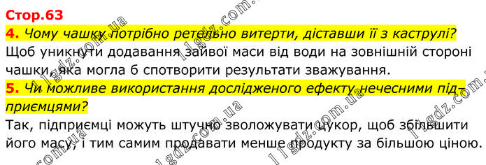 4. Чому чашку потрібно ретельно витерти, діставши її з каструлі? Щоб уникнути додавання зайвої маси від води на зовнішній стороні чашки, яка могла б спотворити результати зважування. 5. Чи можливе використання дослідженого ефекту нечесними підприємцями? Так, підприємці можуть штучно зволожувати цукор, щоб збільшити його масу, і тим самим продавати менше продукту за більшою ціною.