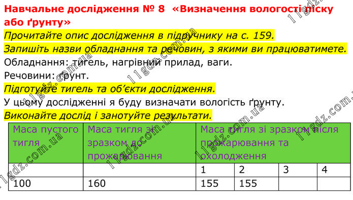 Навчальне дослідження № 8 «Визначення вологості піску або ґрунту» Прочитайте опис дослідження в підручнику на с. 159. Запишіть назви обладнання та речовин, з якими ви працюватимете. Обладнання: тигель, нагрівний прилад, ваги. Речовини: ґрунт. Підготуйте тигель та об’єкти дослідження. У цьому дослідженні я буду визначати вологість ґрунту. Виконайте дослід і занотуйте результати.