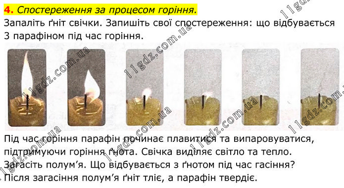 Спостереження за процесом горіння. Запаліть ґніт свічки. Запишіть свої спостереження: що відбувається 3 парафіном під час горіння. Під час горіння парафін починає плавитися та випаровуватися, підтримуючи горіння ґнота. Свічка виділяє світло та тепло. Загасіть полум’я. Що відбувається з ґнотом під час гасіння? Після загасіння полум’я ґніт тліє, а парафін твердіє.