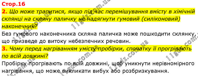 2. Що може трапитися, якщо під час перемішування вмісту в хімічній склянці на скляну паличку не надягнути гумовий (силіконовий) наконечник? Без гумового наконечника скляна паличка може пошкодити склянку, що призведе до витоку небезпечних речовин. 3. Чому перед нагріванням умісту пробірки, спочатку її прогрівають по всій довжині? Пробірку прогрівають по всій довжині, щоб уникнути нерівномірного нагрівання, що може викликати вибух або розбризкування.
