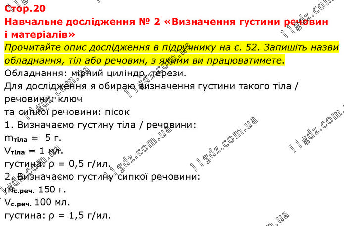 Навчальне дослідження № 2 «Визначення густини речовин і матеріалів» Прочитайте опис дослідження в підручнику на с. 52. Запишіть назви обладнання, тіл або речовин, з якими ви працюватимете. Обладнання: мірний циліндр, терези. Для дослідження я обираю визначення густини такого тіла / речовини: ключ та сипкої речовини: пісок 1. Визначаємо густину тіла / речовини: mтіла = 5 г. Vтіла = 1 мл. густина: ρ = 0,5 г/мл. 2. Визначаємо густину сипкої речовини: mс.реч. 150 г. Vс.реч. 100 мл. густина: ρ = 1,5 г/мл.
