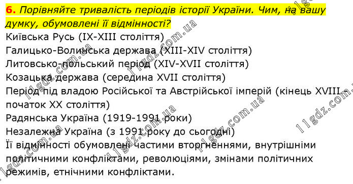 Порівняйте тривалість періодів історії України. Чим, на вашу думку, обумовлені її відмінності? Київська Русь (IX-XIII століття) Галицько-Волинська держава (XIII-XIV століття) Литовсько-польський період (XIV-XVII століття) Козацька держава (середина XVII століття) Період під владою Російської та Австрійської імперій (кінець XVIII - початок XX століття) Радянська Україна (1919-1991 роки) Незалежна Україна (з 1991 року до сьогодні) Її відмінності обумовлені частими вторгненнями, внутрішніми політичними конфліктами, революціями, змінами політичних режимів, етнічними конфліктами.