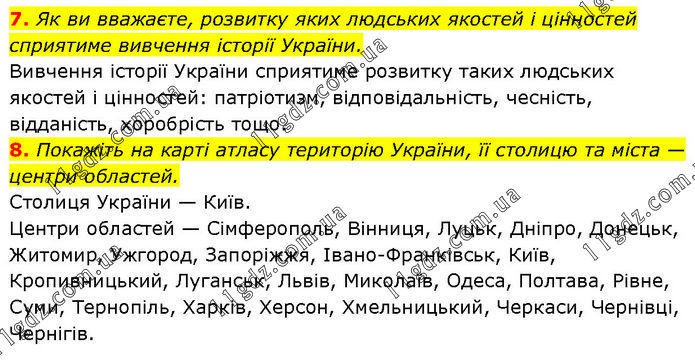 7. Як ви вважаєте, розвитку яких людських якостей і цінностей сприятиме вивчення історії України. Вивчення історії України сприятиме розвитку таких людських якостей і цінностей: патріотизм, відповідальність, чесність, відданість, хоробрість тощо. 8. Покажіть на карті атласу територію України, її столицю та міста — центри областей. Столиця України — Київ. Центри областей — Сімферополь, Вінниця, Луцьк, Дніпро, Донецьк, Житомир, Ужгород, Запоріжжя, Івано-Франківськ, Київ, Кропивницький, Луганськ, Львів, Миколаїв, Одеса, Полтава, Рівне, Суми, Тернопіль, Харків, Херсон, Хмельницький, Черкаси, Чернівці, Чернігів.