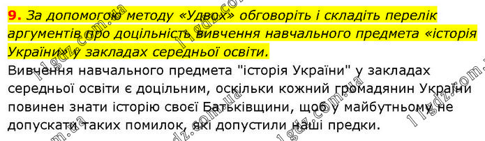 За допомогою методу «Удвох» обговоріть і складіть перелік аргументів про доцільність вивчення навчального предмета «історія України» у закладах середньої освіти. Вивчення навчального предмета "історія України" у закладах середньої освіти є доцільним, оскільки кожний громадянин України повинен знати історію своєї Батьківщини, щоб у майбутньому не допускати таких помилок, які допустили наші предки.