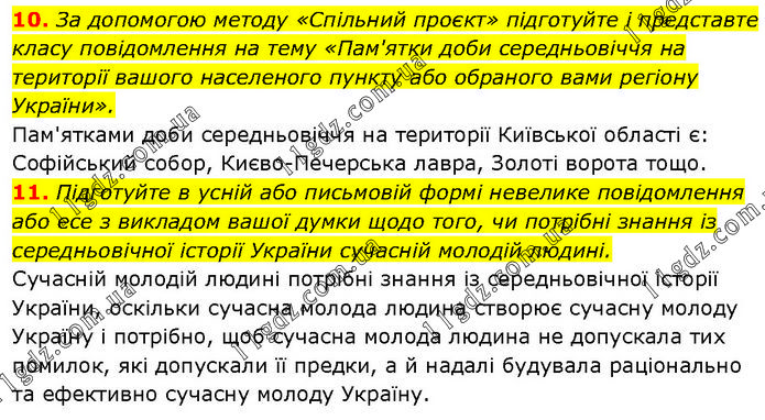 10. За допомогою методу «Спільний проєкт» підготуйте і представте класу повідомлення на тему «Пам'ятки доби середньовіччя на території вашого населеного пункту або обраного вами регіону України». Пам'ятками доби середньовіччя на території Київської області є: Софійський собор, Києво-Печерська лавра, Золоті ворота тощо. 11. Підготуйте в усній або письмовій формі невелике повідомлення або есе з викладом вашої думки щодо того, чи потрібні знання із середньовічної історії України сучасній молодій людині. Сучасній молодій людині потрібні знання із середньовічної історії України, оскільки сучасна молода людина створює сучасну молоду Україну і потрібно, щоб сучасна молода людина не допускала тих помилок, які допускали її предки, а й надалі будувала раціонально та ефективно сучасну молоду Україну.
