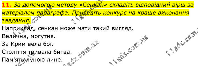 За допомогою методу «Сенкан» складіть відповідний вірш за матеріалом параграфа. Приведіть конкурс на краще виконання завдання. Наприклад, сенкан може мати такий вигляд. Велична, могутня. За Крим вела бої. Століття тривала битва. Пам'ять луною лине.