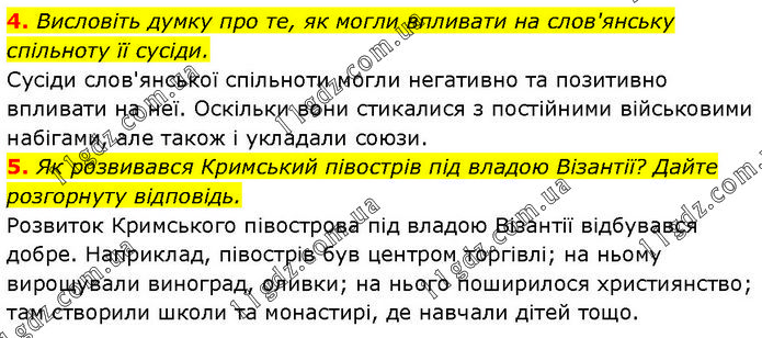 4. Висловіть думку про те, як могли впливати на слов'янську спільноту її сусіди. Сусіди слов'янської спільноти могли негативно та позитивно впливати на неї. Оскільки вони стикалися з постійними військовими набігами, але також і укладали союзи. 5. Як розвивався Кримський півострів під владою Візантії? Дайте розгорнуту відповідь. Розвиток Кримського півострова під владою Візантії відбувався добре. Наприклад, півострів був центром торгівлі; на ньому вирощували виноград, оливки; на нього поширилося християнство; там створили школи та монастирі, де навчали дітей тощо.
