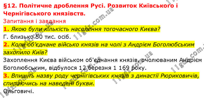 §12. Політичне дроблення Русі. Розвиток Київського і Чернігівського князівств. Запитання і завдання 1. Якою були кількість населення тогочасного Києва? Г. близько 50 тис. осіб. 2. Коли об’єднане військо князів на чолі з Андрієм Боголюбським захопило Київ? Захоплення Києва військом об'єднання князів, очолюваним Андрієм Боголюбським, відбулося 12 березня 1 169 року. 3. Впишіть назву роду чернігівських князів з династії Рюриковичів, спираючись на наведені букви. Ольговичі.
