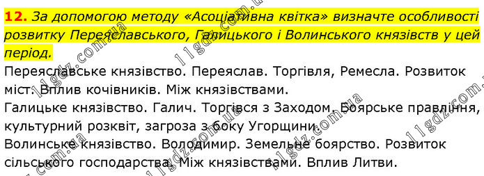 За допомогою методу «Асоціативна квітка» визначте особливості розвитку Переяславського, Галицького і Волинського князівств у цей період. Переяславське князівство. Переяслав. Торгівля, Ремесла. Розвиток міст. Вплив кочівників. Між князівствами. Галицьке князівство. Галич. Торгівся з Заходом. Боярське правління, культурний розквіт, загроза з боку Угорщини. Волинське князівство. Володимир. Земельне боярство. Розвиток сільського господарства. Між князівствами. Вплив Литви.