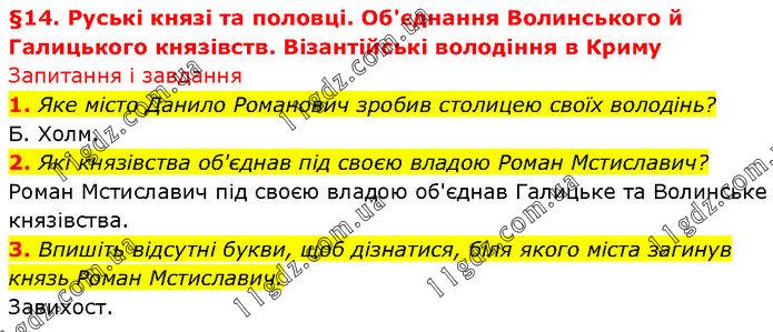 §14. Руські князі та половці. Об'єднання Волинського й Галицького князівств. Візантійські володіння в Криму Запитання і завдання 1. Яке місто Данило Романович зробив столицею своїх володінь? Б. Холм. 2. Які князівства об'єднав під своєю владою Роман Мстиславич? Роман Мстиславич під своєю владою об'єднав Галицьке та Волинське князівства. 3. Впишіть відсутні букви, щоб дізнатися, біля якого міста загинув князь Роман Мстиславич. Завихост.