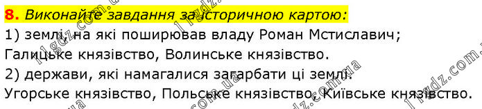 Виконайте завдання за історичною картою: 1) землі, на які поширював владу Роман Мстиславич; Галицьке князівство, Волинське князівство. 2) держави, які намагалися загарбати ці землі. Угорське князівство, Польське князівство, Київське князівство.