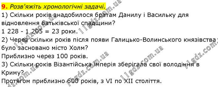 Розв'яжіть хронологічні задачі. 1) Скільки років знадобилося братам Данилу і Васильку для відновлення батьківської спадщини? 1 228 - 1 205 = 23 роки. 2) Через скільки років після появи Галицько-Волинського князівства було засновано місто Холм? Приблизно через 100 років. 3) Скільки років Візантійська імперія зберігала свої володіння в Криму? Протягом приблизно 600 років, з VI по XII століття.