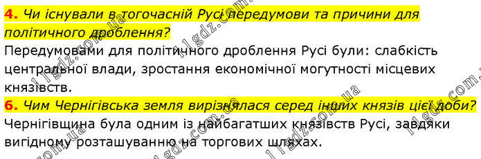 4. Чи існували в тогочасній Русі передумови та причини для політичного дроблення? Передумовами для політичного дроблення Русі були: слабкість центральної влади, зростання економічної могутності місцевих князівств. 6. Чим Чернігівська земля вирізнялася серед інших князів цієї доби? Чернігівщина була одним із найбагатших князівств Русі, завдяки вигідному розташуванню на торгових шляхах.