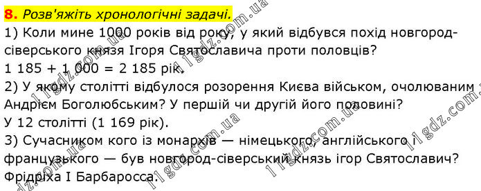 Розв'яжіть хронологічні задачі. 1) Коли мине 1000 років від року, у який відбувся похід новгород-сіверського князя Ігоря Святославича проти половців? 1 185 + 1 000 = 2 185 рік. 2) У якому столітті відбулося розорення Києва військом, очолюваним Андрієм Боголюбським? У першій чи другій його половині? У 12 столітті (1 169 рік). 3) Сучасником кого із монархів — німецького, англійського і французького — був новгород-сіверський князь ігор Святославич? Фрідріха I Барбаросса.
