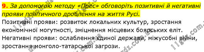 За допомогою методу «Прес» обговоріть позитивні й негативні прояви політичного дроблення на життя Русі. Позитивні прояви: розвиток локальних культур, зростання економічної могутності, зміцнення місцевих боярських еліт. Негативні прояви: ослаблення єдиної держави, міжусобні війни, зростання монголо-татарської загрози.