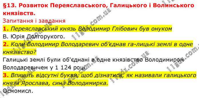 §13. Розвиток Переяславського, Галицького і Волинського князівств. Запитання і завдання 1. Переяславський князь Володимир Глібович був онуком В. Юрія Долгорукого. 2. Коли Володимир Володаревич об’єднав га-лицькі землі в одне князівство? Галицькі землі були об'єднані в одне князівство Володимиром Володаревичем у 1 124 році. 3. Впишіть відсутні букви, щоб дізнатися, як називали галицького князя Ярослава, сина Володимирка. Осмомисл.