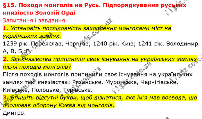 §15. Походи монголів на Русь. Підпорядкування руських князівств Золотій Орді Запитання і завдання 1. Установіть послідовність захоплення монголами міст на українських землях. 1239 рік. Переяслав, Чернігів; 1240 рік. Київ; 1241 рік. Володимир. А, В, Б, Г. 2. Які князівства припинили своє існування на українських землях після походів монголів? Після походів монголів припинили своє існування на українських землях такі князівства: Рязанське, Муромське, Чернігівське, Київське, Полоцьке, Турівське. 3. Впишіть відсутні букви, щоб дізнатися, яке ім'я мав воєвода, що очолював оборону Києва від монголів. Дмитро.
