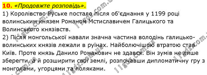 «Продовжте розповідь». 1) Королівство Руське постало після об'єднання у 1199 році волинським князем Романом Мстиславичем Галицького та Волинського князівств. 2) Після монгольської навали значна частина володінь галицько-волинських князів лежали в руїнах. Найболючішою втратою став Київ. Проте князь Данило Романович не здався. Він зумів не лише зберегти, а й розширити свої землі, розпочавши дипломатичну гру з монголами, угорцями та поляками.