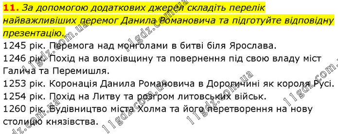 За допомогою додаткових джерел складіть перелік найважливіших перемог Данила Романовича та підготуйте відповідну презентацію. 1245 рік. Перемога над монголами в битві біля Ярослава. 1246 рік. Похід на волохівщину та повернення під свою владу міст Галича та Перемишля. 1253 рік. Коронація Данила Романовича в Дорогичині як короля Русі. 1254 рік. Похід на Литву та розгром литовських військ. 1260 рік. Будівництво міста Холма та його перетворення на нову столицю князівства.