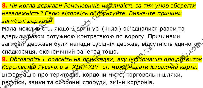 8. Чи могла держави Романовичів можливість за тих умов зберегти незалежність? Свою відповідь обґрунтуйте. Визначте причини загибелі держави. Мала можливість, якщо б вони усі (князі) об'єдналися разом та вдарили разом потужною контратакою по ворогу. Причинами загибелі держави були напади сусідніх держав, відсутність єдиного спадкоємця, економічний занепад тощо. 9. Обговоріть і поясніть на прикладах, яку інформацію про розвиток Королівства Руського в ХІІІ—ХІV ст. може надати історична карта. Інформацію про територію, кордони міста, торговельні шляхи, ресурси, замки та оборонні споруди, зміни кордонів.