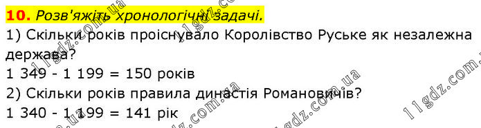 10. Розв'яжіть хронологічні задачі. 1) Скільки років проіснувало Королівство Руське як незалежна держава? 1 349 - 1 199 = 150 років 2) Скільки років правила династія Романовичів? 1 340 - 1 199 = 141 рік