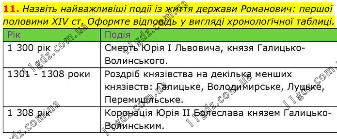 Назвіть найважливіші події із життя держави Романович: першої половини XIV ст. Оформте відповідь у вигляді хронологічної таблиці. Рік Подія 1 300 рік Смерть Юрія I Львовича, князя Галицько-Волинського. 1301 - 1308 роки Роздріб князівства на декілька менших князівств: Галицьке, Володимирське, Луцьке, Перемишльське. 1 308 рік Коронація Юрія II Болеслава князем Галицько-Волинським.