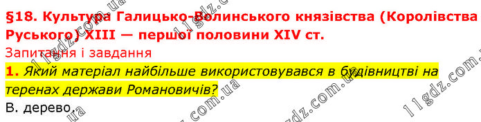 §18. Культура Галицько-Волинського князівства (Королівства Руського) XIII — першої половини XIV ст. Запитання і завдання 1. Який матеріал найбільше використовувався в будівництві на теренах держави Романовичів? В. дерево.