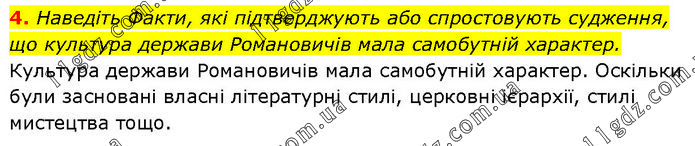 Наведіть Факти, які підтверджують або спростовують судження, що культура держави Романовичів мала самобутній характер. Культура держави Романовичів мала самобутній характер. Оскільки були засновані власні літературні стилі, церковні ієрархії, стилі мистецтва тощо.