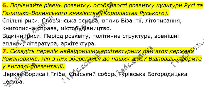 6. Порівняйте рівень розвитку, особливості розвитку культури Русі та Галицько-Волинського князівства (Королівства Руського). Спільні риси. Слов'янська основа, вплив Візантії, літописання, книгописна справа, містобудівництво. Відмінні риси. Період розквіту, політична структура, зовнішні впливи, література, архітектура. 7. Складіть перелік найвідоміших архітектурних пам'яток держави Романовичів. Які з них збереглися до наших днів? Відповідь оформте у вигляді презентації. Церква Бориса і Гліба. Спаський собор. Турівська Богородицька церква.