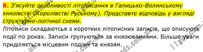 З'ясуйте особливості літописання в Галицько-Волинському князівстві (Королівстві Руському). Представте відповідь у вигляді структурно-логічної схеми. Літописи складаютсья з коротких літописних записів, що описують події по роках. Записи групуються за князюваннями. Більше уваги приділяється місцевим подіям та князям.