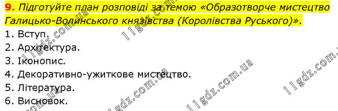 Підготуйте план розповіді за темою «Образотворче мистецтво Галицько-Волинського князівства (Королівства Руського)». 1. Вступ. 2. Архітектура. 3. Іконопис. 4. Декоративно-ужиткове мистецтво. 5. Література. 6. Висновок.
