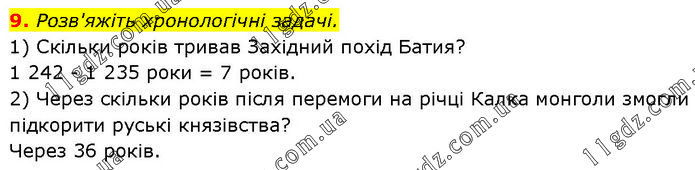 Розв'яжіть хронологічні задачі. 1) Скільки років тривав Західний похід Батия? 1 242 - 1 235 роки = 7 років. 2) Через скільки років після перемоги на річці Калка монголи змогли підкорити руські князівства? Через 36 років.