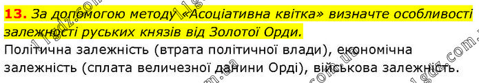 За допомогою методу «Асоціативна квітка» визначте особливості залежності руських князів від Золотої Орди. Політична залежність (втрата політичної влади), економічна залежність (сплата величезної данини Орді), військова залежність.