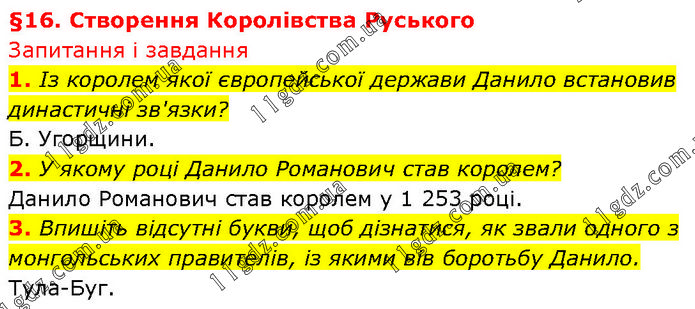 §16. Створення Королівства Руського Запитання і завдання 1. Із королем якої європейської держави Данило встановив династичні зв'язки? Б. Угорщини. 2. У якому році Данило Романович став королем? Данило Романович став королем у 1 253 році. 3. Впишіть відсутні букви, щоб дізнатися, як звали одного з монгольських правителів, із якими вів боротьбу Данило. Тула-Буг.