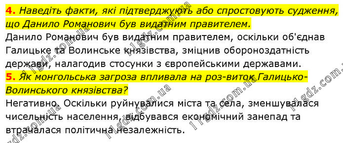 4. Наведіть факти, які підтверджують або спростовують судження, що Данило Романович був видатним правителем. Данило Романович був видатним правителем, оскільки об'єднав Галицьке та Волинське князівства, зміцнив обороноздатність держави, налагодив стосунки з європейськими державами. 5. Як монгольська загроза впливала на роз-виток Галицько-Волинського князівства? Негативно. Оскільки руйнувалися міста та села, зменшувалася чисельність населення, відбувався економічний занепад та втрачалася політична незалежність.