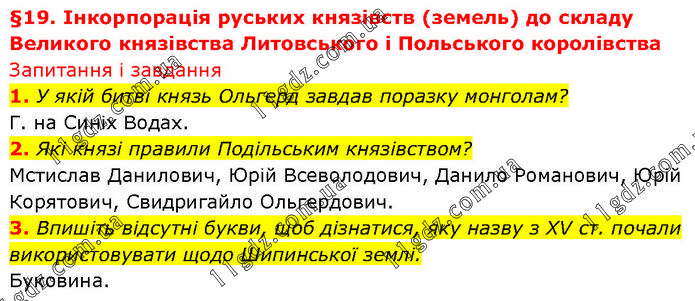 §19. Інкорпорація руських князівств (земель) до складу Великого князівства Литовського і Польського королівства Запитання і завдання 1. У якій битві князь Ольгерд завдав поразку монголам? Г. на Синіх Водах. 2. Які князі правили Подільським князівством? Мстислав Данилович, Юрій Всеволодович, Данило Романович, Юрій Корятович, Свидригайло Ольгердович. 3. Впишіть відсутні букви, щоб дізнатися, яку назву з XV ст. почали використовувати щодо Шипинської землі. Буковина.