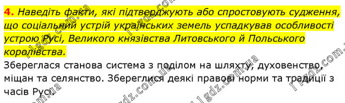 Наведіть факти, які підтверджують або спростовують судження, що соціальний устрій українських земель успадкував особливості устрою Русі, Великого князівства Литовського й Польського королівства. Збереглася станова система з поділом на шляхту, духовенство, міщан та селянство. Збереглися деякі правові норми та традиції з часів Русі.