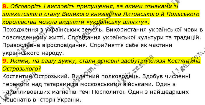 8. Обговоріть і висловіть припущення, за якими ознаками зі шляхетського стану Великого князівства Литовського й Польського королівства можна виділити «українську шляхту». Походження з українських земель. Використання української мови в повсякденному житті. Сповідання української культури та традицій. Православне віросповідання. Сприйняття себе як частини українського народу. 9. Якими, на вашу думку, стали основні здобутки князя Костянтина Острозького? Костянтин Острозький. Видатний полководець. Здобув численні перемоги над татарами та московськими військами. Один з найвпливовіших магнатів Речі Посполитої. Один з найщедріших меценатів в історії України.