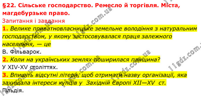§22. Сільське господарство. Ремесло й торгівля. Міста, магдебурзьке право. Запитання і завдання 1. Велике приватновласницьке земельне володіння з натуральним господарством, у якому застосовувалася праця залежного населення, — це В. Фільварок. 2. Коли на українських землях поширилася панщина? У XIV-XV століттях. 3. Впишіть відсутні літери, щоб отримати назву організації, яка захищала інтереси купців у Західній Європі ХІІ—ХV ст. Гільдія.