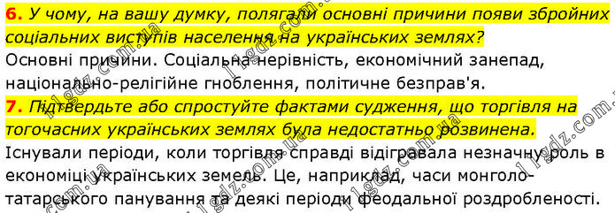 6. У чому, на вашу думку, полягали основні причини появи збройних соціальних виступів населення на українських землях? Основні причини. Соціальна нерівність, економічний занепад, національно-релігійне гноблення, політичне безправ'я. 7. Підтвердьте або спростуйте фактами судження, що торгівля на тогочасних українських землях була недостатньо розвинена. Існували періоди, коли торгівля справді відігравала незначну роль в економіці українських земель. Це, наприклад, часи монголо-татарського панування та деякі періоди феодальної роздробленості.