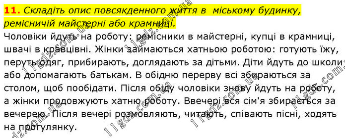 Складіть опис повсякденного життя в міському будинку, ремісничій майстерні або крамниці. Чоловіки йдуть на роботу: ремісники в майстерні, купці в крамниці, швачі в кравцівні. Жінки займаються хатньою роботою: готують їжу, перуть одяг, прибирають, доглядають за дітьми. Діти йдуть до школи або допомагають батькам. В обідню перерву всі збираються за столом, щоб пообідати. Після обіду чоловіки знову йдуть на роботу, а жінки продовжують хатню роботу. Ввечері вся сім'я збирається за вечерею. Після вечері розмовляють, читають, співають пісні, ходять на прогулянку.