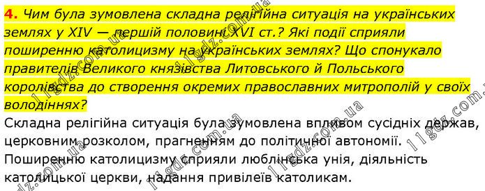 Чим була зумовлена складна релігійна ситуація на українських землях у XIV — першій половині XVI ст.? Які події сприяли поширенню католицизму на українських землях? Що спонукало правителів Великого князівства Литовського й Польського королівства до створення окремих православних митрополій у своїх володіннях? Складна релігійна ситуація була зумовлена впливом сусідніх держав, церковним розколом, прагненням до політичної автономії. Поширенню католицизму сприяли люблінська унія, діяльність католицької церкви, надання привілеїв католикам.