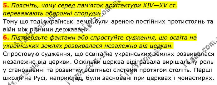 5. Поясніть, чому серед пам’яток архітектури XIV—XV ст. переважають оборонні споруди. Тому що тоді українські землі були ареною постійних протистоянь та війн між різними державами. 6. Підтвердьте фактами або спростуйте судження, що освіта на українських землях розвивалася незалежно від церкви. Спростовую судження, що освіта на українських землях розвивалася незалежно від церкви. Оскільки церква відігравала вирішальну роль у становленні та розвитку освітньої системи протягом століть. Перші школи на Русі, наприклад, були засновані при церквах і монастирях.