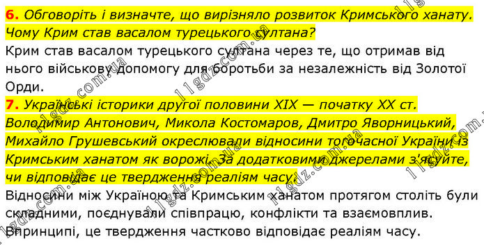 6. Обговоріть і визначте, що вирізняло розвиток Кримського ханату. Чому Крим став васалом турецького султана? Крим став васалом турецького султана через те, що отримав від нього військову допомогу для боротьби за незалежність від Золотої Орди. 7. Українські історики другої половини XIX — початку XX ст. Володимир Антонович, Микола Костомаров, Дмитро Яворницький, Михайло Грушевський окреслювали відносини тогочасної України із Кримським ханатом як ворожі. За додатковими джерелами з'ясуйте, чи відповідає це твердження реаліям часу. Відносини між Україною та Кримським ханaтом протягом століть були складними, поєднували співпрацю, конфлікти та взаємовплив. Впринципі, це твердження частково відповідає реаліям часу.