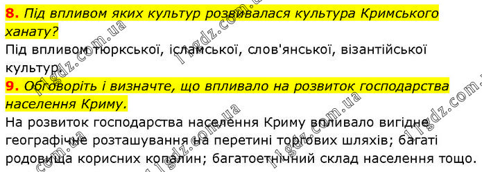 8. Під впливом яких культур розвивалася культура Кримського ханату? Під впливом тюркської, ісламської, слов'янської, візантійської культур. 9. Обговоріть і визначте, що впливало на розвиток господарства населення Криму. На розвиток господарства населення Криму впливало вигідне географічне розташування на перетині торгових шляхів; багаті родовища корисних копалин; багатоетнічний склад населення тощо.